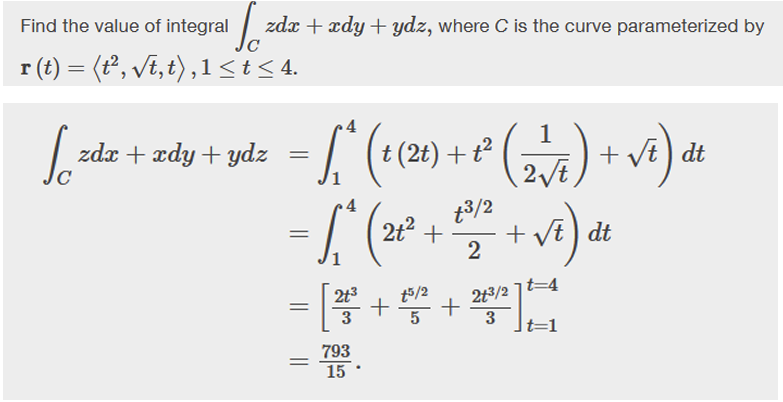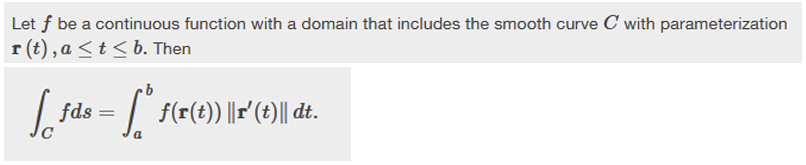 \[ \int_a^b f(x(t),y(t),z(t))\sqrt{\left(\frac{dx}{dt}\right)^2 + \left(\frac{dy}{dt}\right)^2 + \left(\frac{dz}{dt}\right)^2} dt. \]
