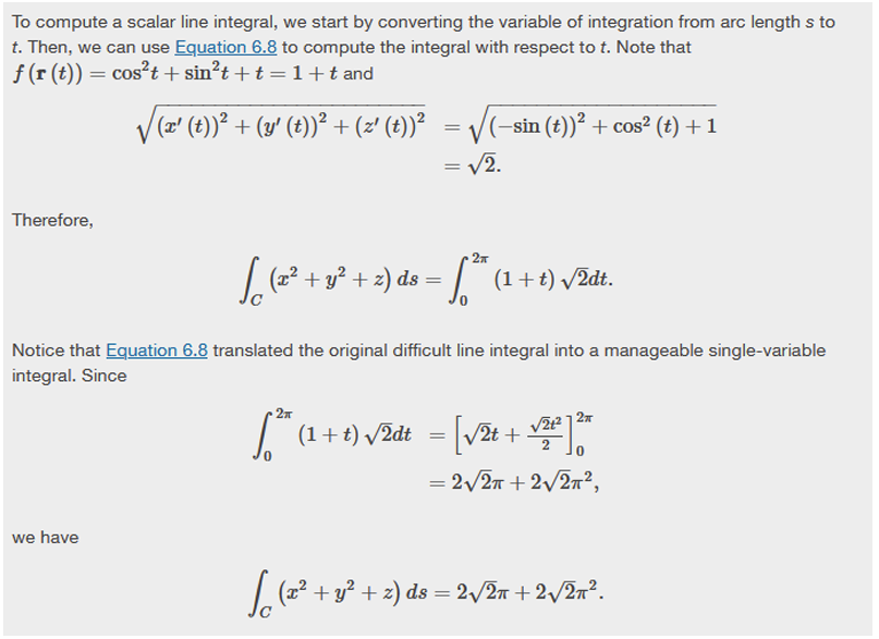 Note that in a scalar line integral, the integration is done with respect to arc length s, which can make a scalar line integral difficult to calculate. To make the calculations easier, we can translate ∫C f ds to an integral with a variable of integration that is t.