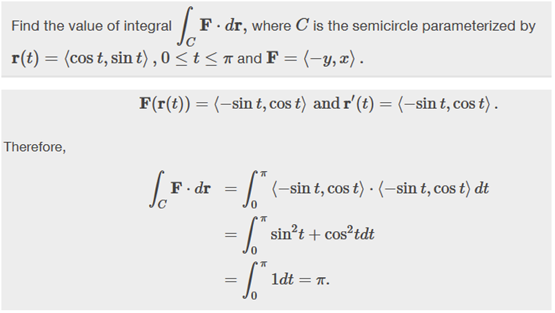 \[ \int_C F \cdot Tds = \int_a^b F(r(t)) \cdot r’ (t) dt. \]