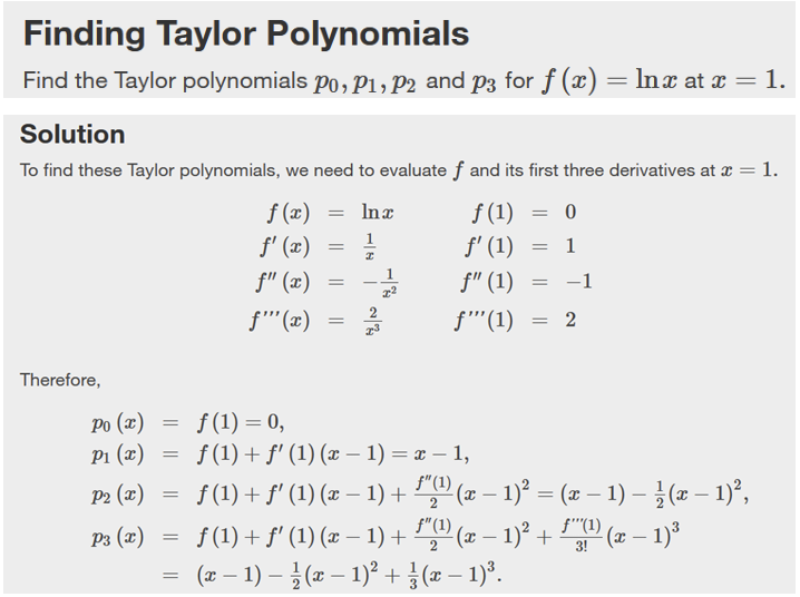 \[ p_3 (x) = f(a) + f'(a)(x-a) + \frac{f”(a)}{2!}(x-a)^2 + \frac{f”'(a)}{3!}(x-a)^3, \]