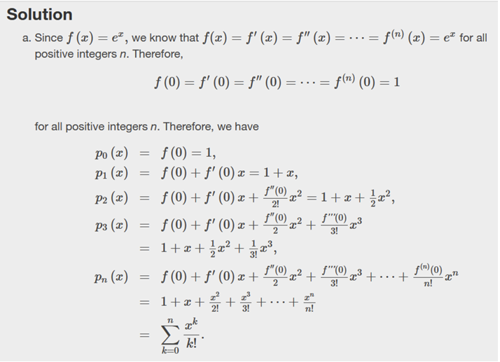Let us approximate the exponential function f(x) = ex using a Taylor polynomial centered at a = 0. Since all derivatives of ex are equal to ex we have fn(0) = 1 for all n.